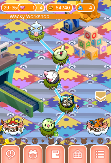 - En la versión movil de Shuffle se han añadido 15 nuevas fases normales a la Fábrica de Juguetes, en estas nuevas fases tenemos a: Solosis, Honedge, Drillbur, Larvitar, Shuppet, Rufflet, Bergmite, Mightyena, Snubbull, Lickitung, Timburr, Banette, Tangela, Pupitar y un Mega Aerodactyl.