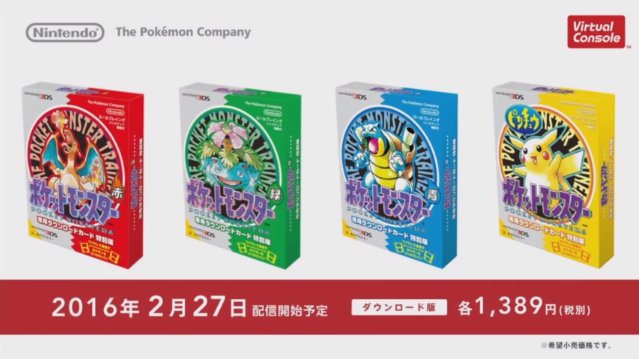 En Japón venderán las cuatro ediciones de Pokémon Rojo, Azul, Amarillo y Verde en formato físico para 3DS, incluyendo la caja. Los juegos llegaran a Europa el 27 de Febrero.