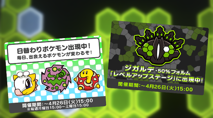 -En primer lugar, una fase gradual para Zygarde 50% (el que todos conocemos de los juegos X e Y) ha dado comienzo. Acaba el día 26 de Abril. Además, como siempre recordaros que en estas fases nos regalan objetos según subimos de nivel en la misma. Los más destacados de esta son los siguientes:
