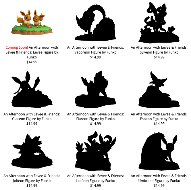 Después de la colaboración de Funko y Pokémon con la línea de figuras A Day with Pikachu, llega An Afternoon with Eevee & Friends, una colección que consta con un total de 9 figuras en las que aparecen Eevee y sus evoluciones.