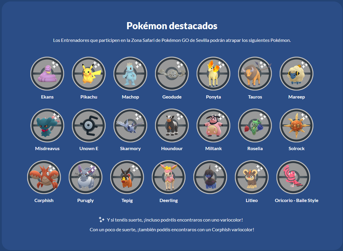 Niantic ha compartido novedades sobre la Zona Safari de Pokémon GO que se celebrará en España, Sevilla. Mediante esta actualización se ha podido conocer un listado completo de Pokémon destacados que aparecerán durante el evento presencial, es decir, que serán mucho más comunes.