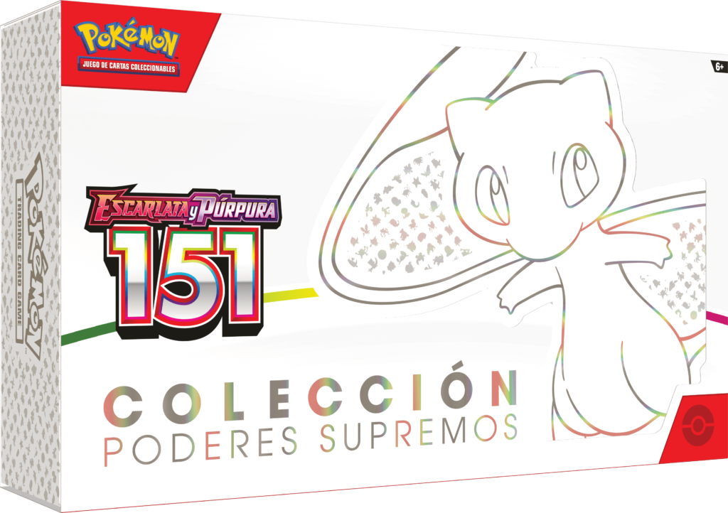 - Colección Poderes Supremos de Escarlata y Púrpura-151: Incluye 16 paquetes de mejora de Escarlata y Púrpura-151, una carta metálica de rareza Rara Híper de Mew ex, una carta de promoción de rareza Rara Ilustración de Mew ex, una carta de promoción de rareza Rara Ilustración de Mewtwo, un tapete de juego de Mew con costura en el borde, una caja para cartas, una moneda de Mew y varios accesorios del juego