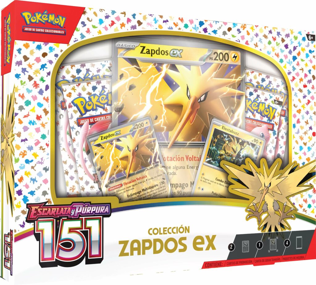 - Colección Zapdos ex de Escarlata y Púrpura-151: Incluye cuatro paquetes de mejora de Escarlata y Púrpura-151, una carta de rareza Rara Doble de Zapdos ex, una carta holográfica de promoción de Electabuzz y una carta de gran tamaño de Zapdos ex