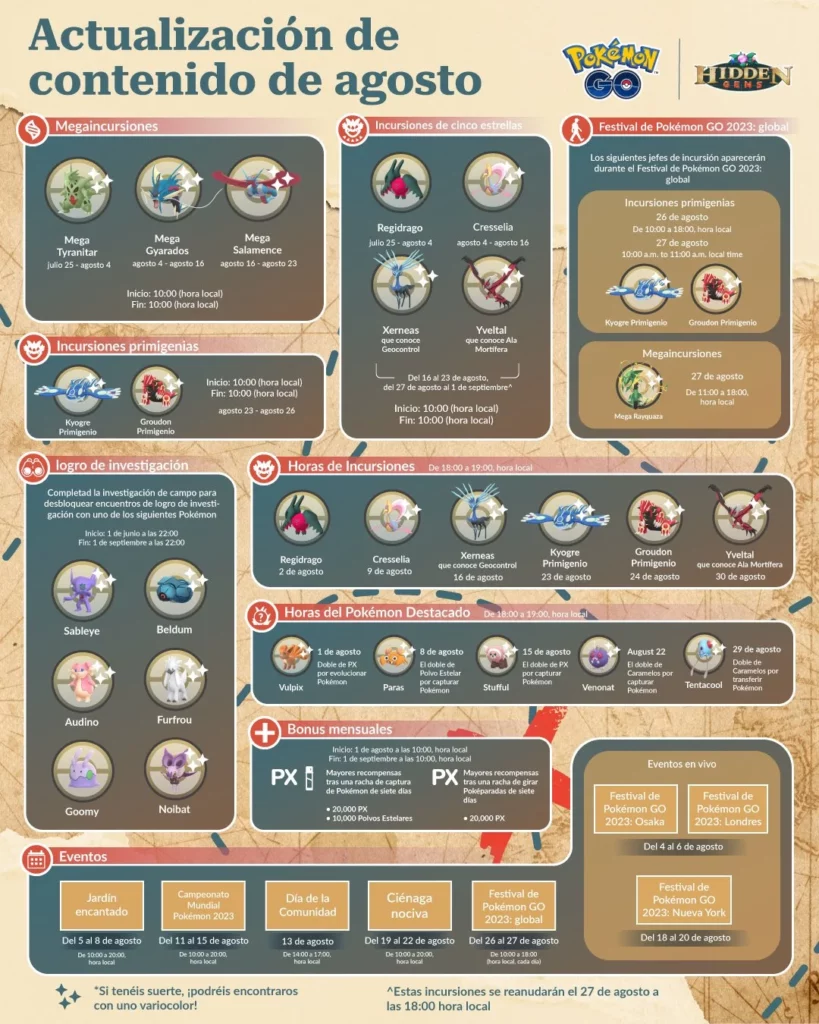Pokémon GO ha detallado todo el contenido y novedades que recibiremos a lo largo de este próximo y caluroso mes de agosto de 2023. Como ya va siendo habitual, toda la información se ha compartido mediante una imagen.