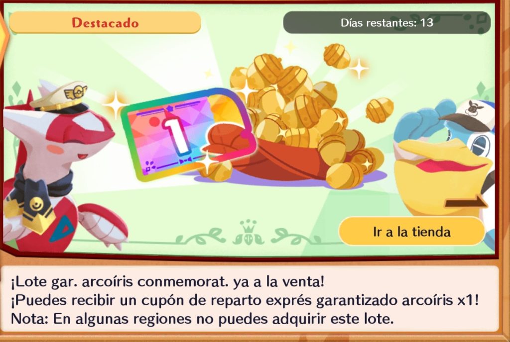 El primer Lote consistirá en el Lote Garantizado Arcoiris Conmemorativo, el cual, aparte de contener 40.000 bellotas, también recompensará con un Cupón de reparto exprés garantizado arcoíris Con este cupón podremos garantizar la obtención de un Pokémon o atuendo de rango arcoiris o superior. Aparte de las recompensas permanentes de rango arcoiris disponibles en todos los eventos de Reparto, se incluirá también a Latias de Conmemoración. Este lote estará disponible hasta el 10 de noviembre tendrá un precio total de 29,99 €.