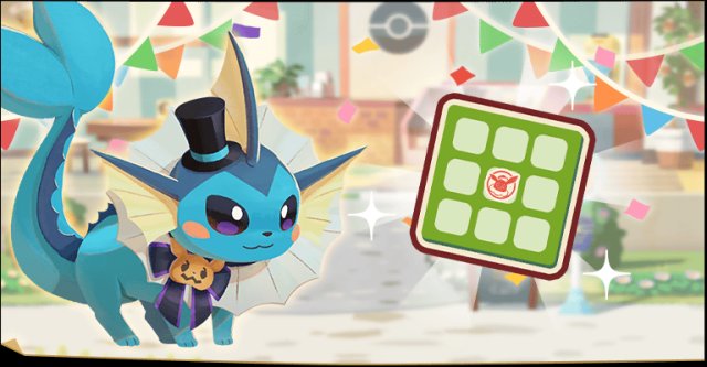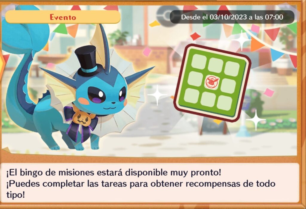 De la misma manera que el resto de eventos de Halloween, Vaporeon contará con el sombrero de copa y el lazo típicos de este evento. En su evento particular, se nos otorgará una ficha de Bingo de 5×5 casillas, cada una de ellas con una misión asignada. La forma de obtener recompensas será simple, por cada línea de 5 casillas horizontales, verticales o diagonales que completemos, obtendremos una recompensa del listado. Estos premios estarán compuestos de diferentes recursos a utilizar para mejor a nuestro equipo, como bellotas y tartaletas de experiencia, pero aumentando en su calidad conforme completemos líneas de los paneles. Además de ello, también obtendremos una recompensa de mayor calidad si conseguimos completar todas las casillas y cantar bingo.