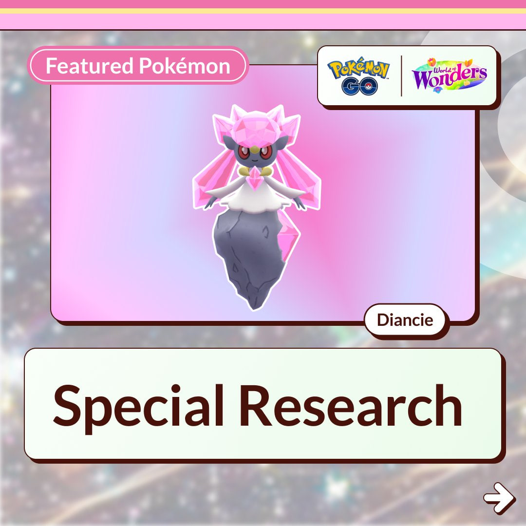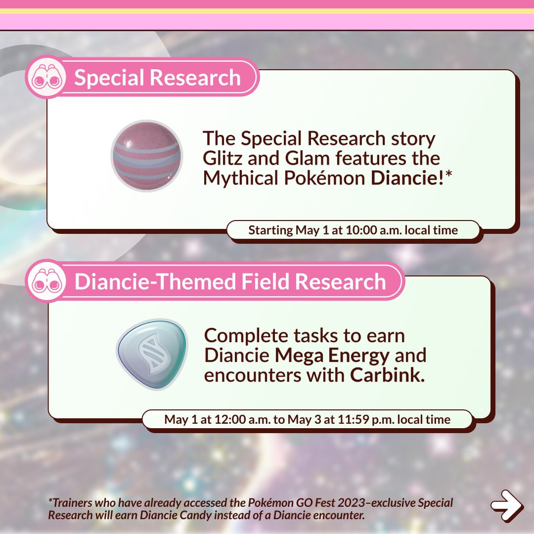 Diancie llegará a Pokémon GO para todos los jugadores a principios de mayo mediante una investigación especial gratuita, «Destellos y diamantes», que podrá ser completada en cualquier momento. Este Pokémon Joya, de tipo Roca/Hada y singular de sexta generación además cuenta con megaevolución, la cuál también podremos obtener.