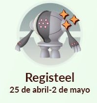 En las incursiones legendarias tendremos la presencia de Registeel, quién será además el protagonista de la hora de incursiones del miércoles 1 de mayo desde las 18:00 a las 19:00, hora local. Este cambiará el jueves 2 de mayo a las 10:00, hora local. Lo sustituirá Tapu Fini.