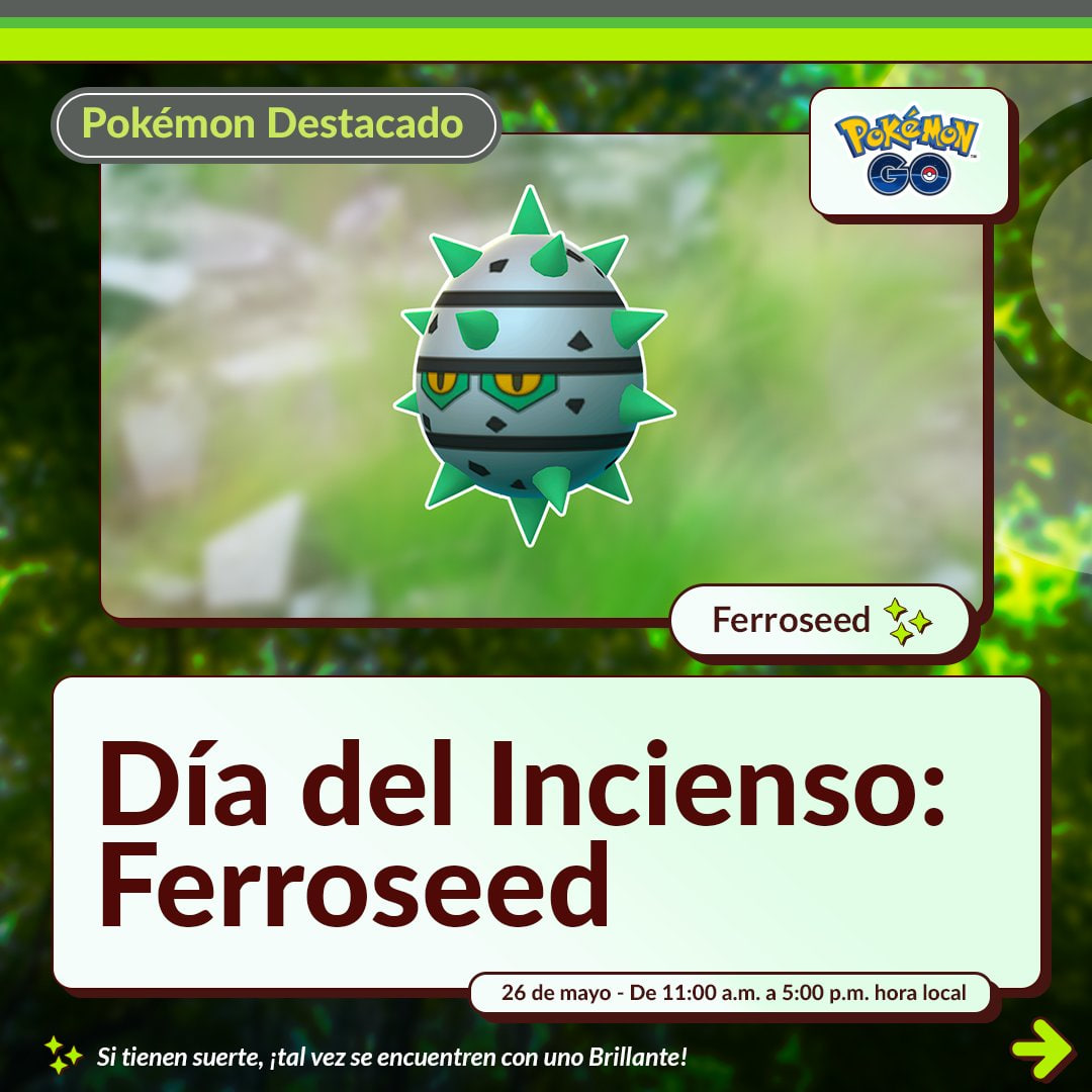 Ya sabíamos la fecha de este Día del Incienso. Pokémon GO ha dado a conocer que Ferroseed será el Pokémon protagonista para el Día del Incienso en este mes de mayo de 2024. Junto a Ferroseed y su probabilidad de ser variocolor aumentada, tendremos la posibilidad de encontrar Pokémon de tipo Planta y tipo Acero en horas alternas mientras usemos un Incienso.
