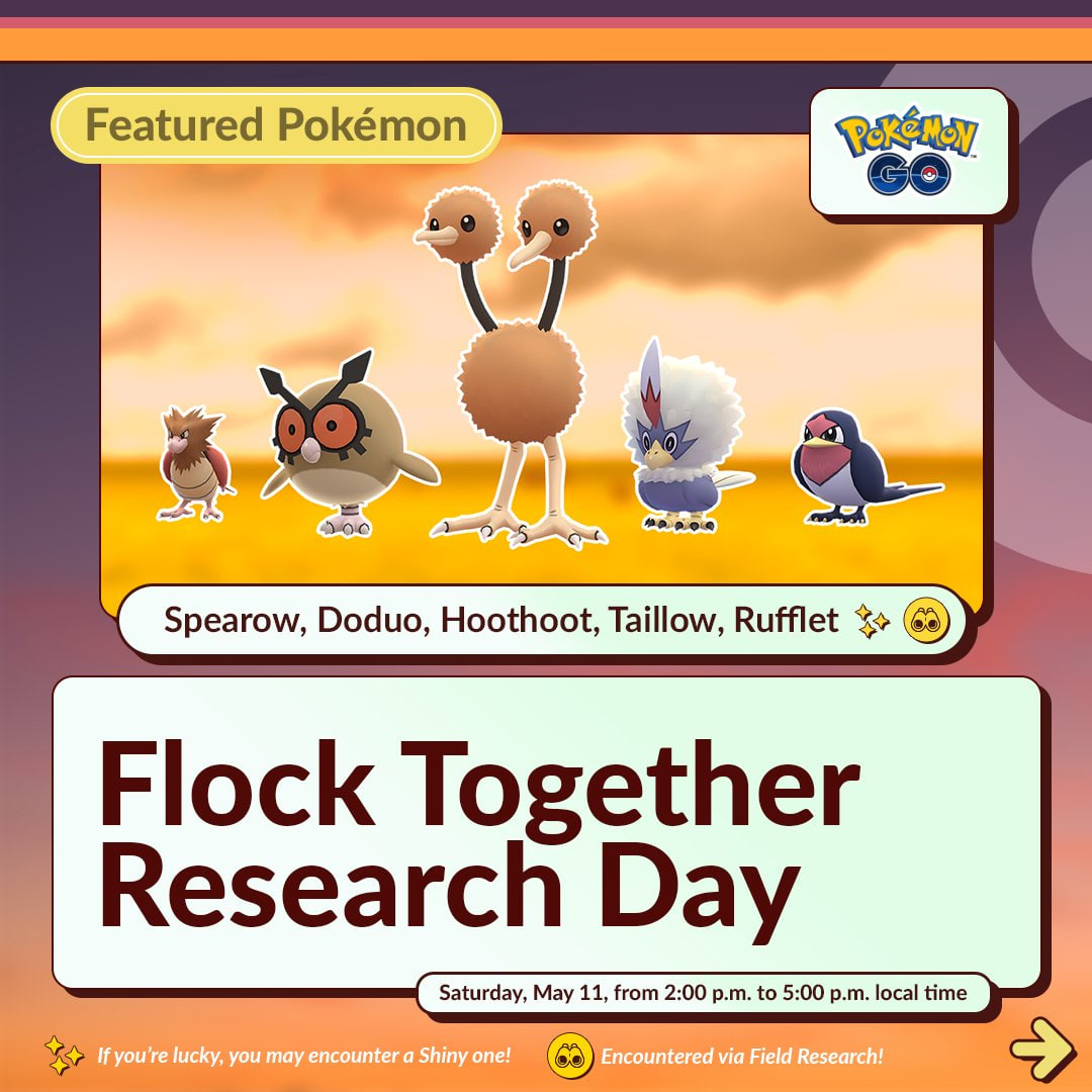 El sábado 11 de mayo, de 14:00 a 17:00 tendrá lugar el Día de Investigación en bandada en Pokémon GO.