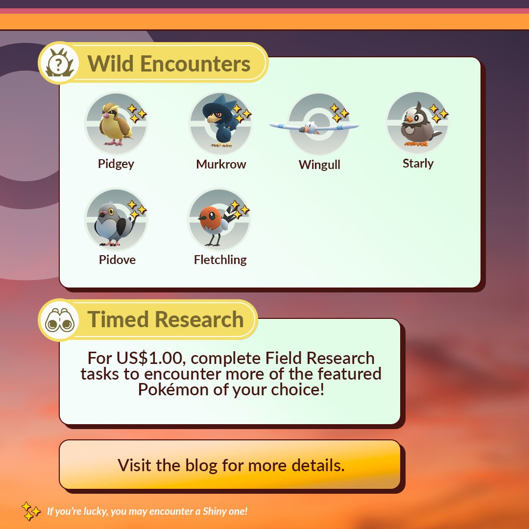 En este día, tendremos que cumplir las tareas de investigación de campo que encontraremos al girar fotodiscos en las Poképaradas para poder obtener como recompensa a los Pokémon de tipo volador destacados en este evento, que serán los siguientes: