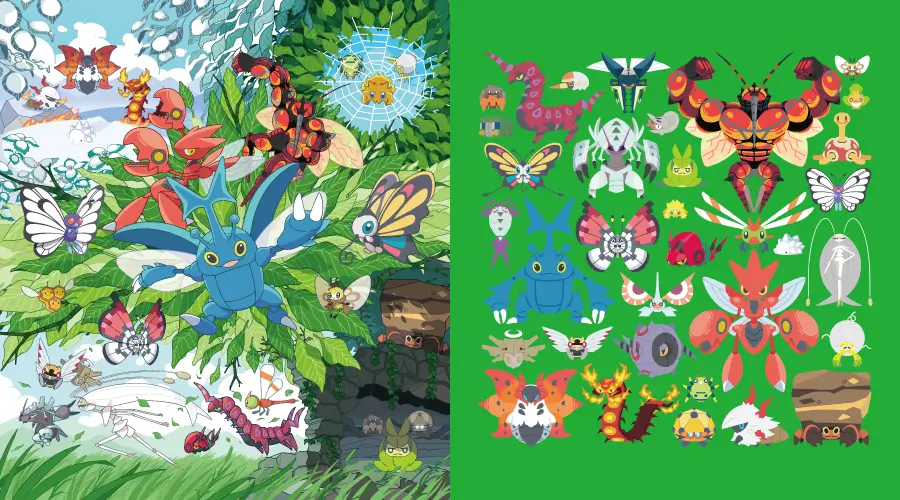 La colección presenta principalmente ilustraciones del artista Wataru Uekusa, que se utilizan en diversos artículos como manteles, fundas de cartas y más. «¡Bug out!» también incluye peluches de Pokémon, uno del Ultraente Buzzwole y otro más pequeño de Heracross.