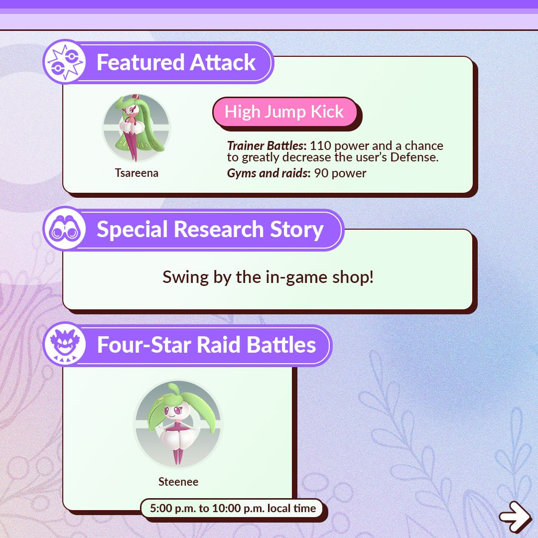 Los Steenee (la evolución de Bounsweet) evolucionados a Tsareena durante el evento aprenderán el ataque cargado Pat. Salto Alta: