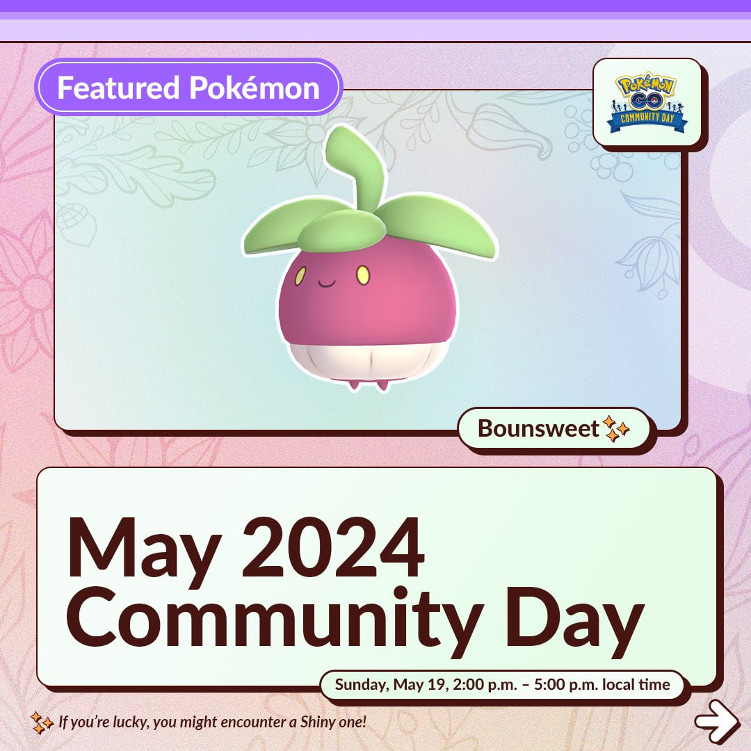 Ya sabíamos que la fecha del siguiente día de la comunidad iba a ser el 19 de mayo. Pokémon GO ha dado a conocer que Bounsweet será el Pokémon protagonista para el Día de la Comunidad en este mes de mayo de 2024. El evento se realizará como siempre, ofreciendo mayor aparición del Pokémon en estado salvaje y una mayor posibilidad de encontrarse con su forma variocolor.