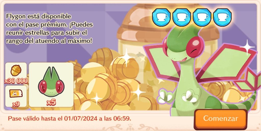 Con la llegada del mes de junio, Pokémon Café ReMix ha recibido un nuevo Pase Mensual centrado en el Pokémon Flygon. Este pase contará con objetos que ayudarán a la mejora de nuestros Pokémon, contando con objetos de recuperación de energía y bellotas, entre otros.