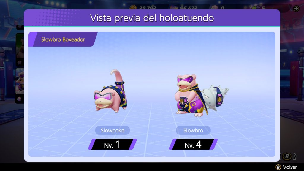 El holoatuendo de Slowbro Boxeador modifica las animaciones de tantos, reaparición, KO y desplazamiento. Además, su preevolución Slowpoke también recibirá cambios visuales, utilizando un traje de boxeador similar al de Slowbro. A continuación os mostramos una galería con varias imágenes del Pokémon desde distintos ángulos, también se muestra el aspecto que tendrá Slowbro dentro del juego.