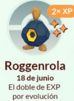 La hora destacada de esta semana será la de Roggenrola, con Doble de PX por evolución.  Esta tendrá lugar el martes 18 de junio de 18:00 a 19:00, hora local.