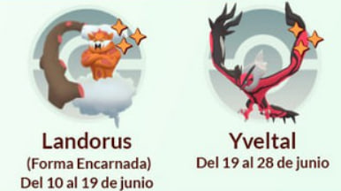 En las incursiones legendarias tendremos la presencia de Landorus forma Avatar (o Encarnada), quien cambiará por Yveltal el 19 de junio a las 10:00, hora local. Yveltal será el protagonista de la hora de incursiones del miércoles 19 de junio desde las 18:00 a las 19:00, hora local.