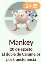 La hora destacada de esta semana será la de Mankey, con doble de Caramelos por Transferencia. Esta tendrá lugar el martes 20 de agosto de 18:00 a 19:00, hora local.