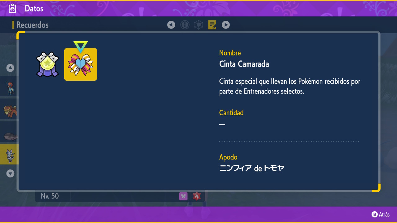 Finalmente, esta adorable evolución de Eevee de tipo hada también trae consigo dos cintas: por un lado, viene acompañado de la Cinta Campeón de Torneo por haber vencido en un torneo, y por otra parte, cuenta con la Cinta Camarada, con la cual recuerda su Entrenador Original.