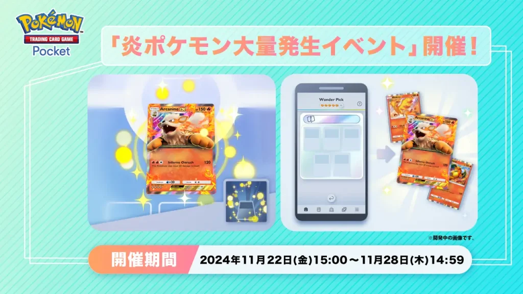 Durante el «Evento Botín Arcanine EX» podemos obtener cartas de Pokémon tipo Fuego en elecciones especiales y elecciones extra. También se podrá obtener un efecto visual adicional a través de canjes durante el evento.