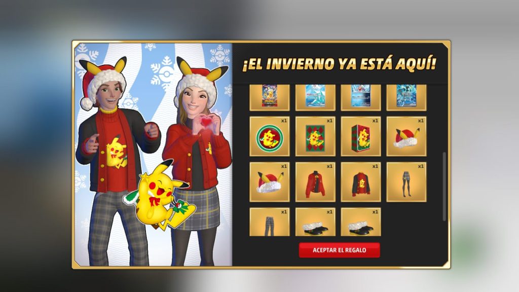 Esta promoción nos permitirá obtener incluso sobres de mejora que ofrecerán cartas aleatorias, personalización para nuestros mazos con un Pikachu navideño para las cartas, la caja y la moneda, e incluso un atuendo navideño completo para nuestro avatar de Pokémon TCG Live.