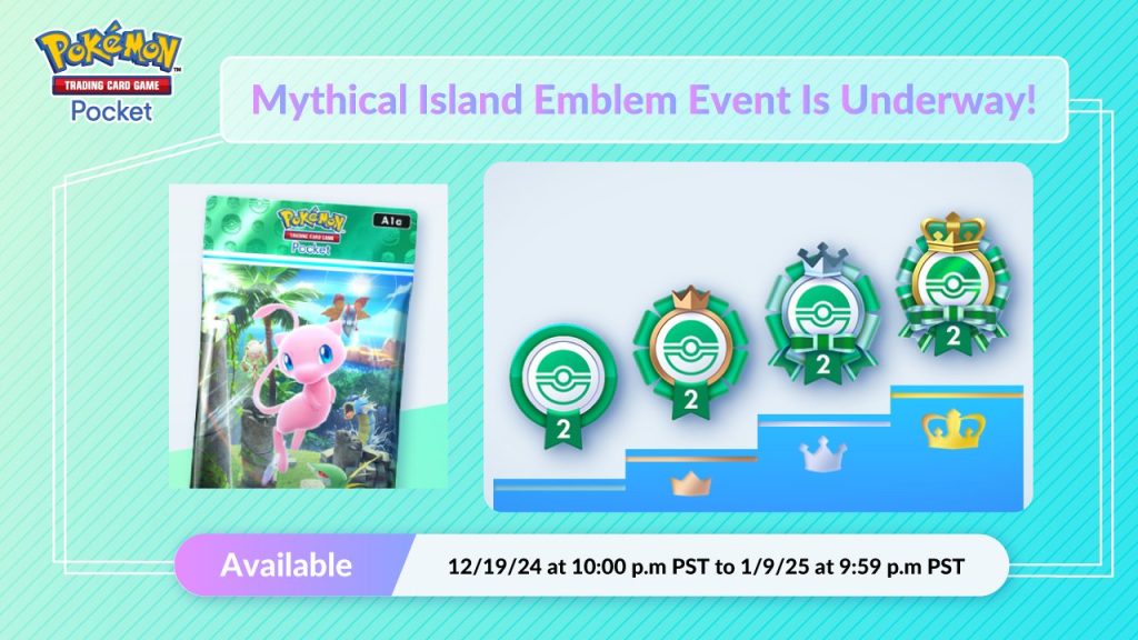 Pokémon TCG Pocket ha dado inicio al «Evento emblema La Isla Singular». En este evento, los jugadores deben competir en partidas contra otros para obtener emblemas especiales, los cuales se ganan según el número de victorias obtenidas. Estos emblemas se pueden mostrar en el perfil del jugador, y, son exclusivos del evento.