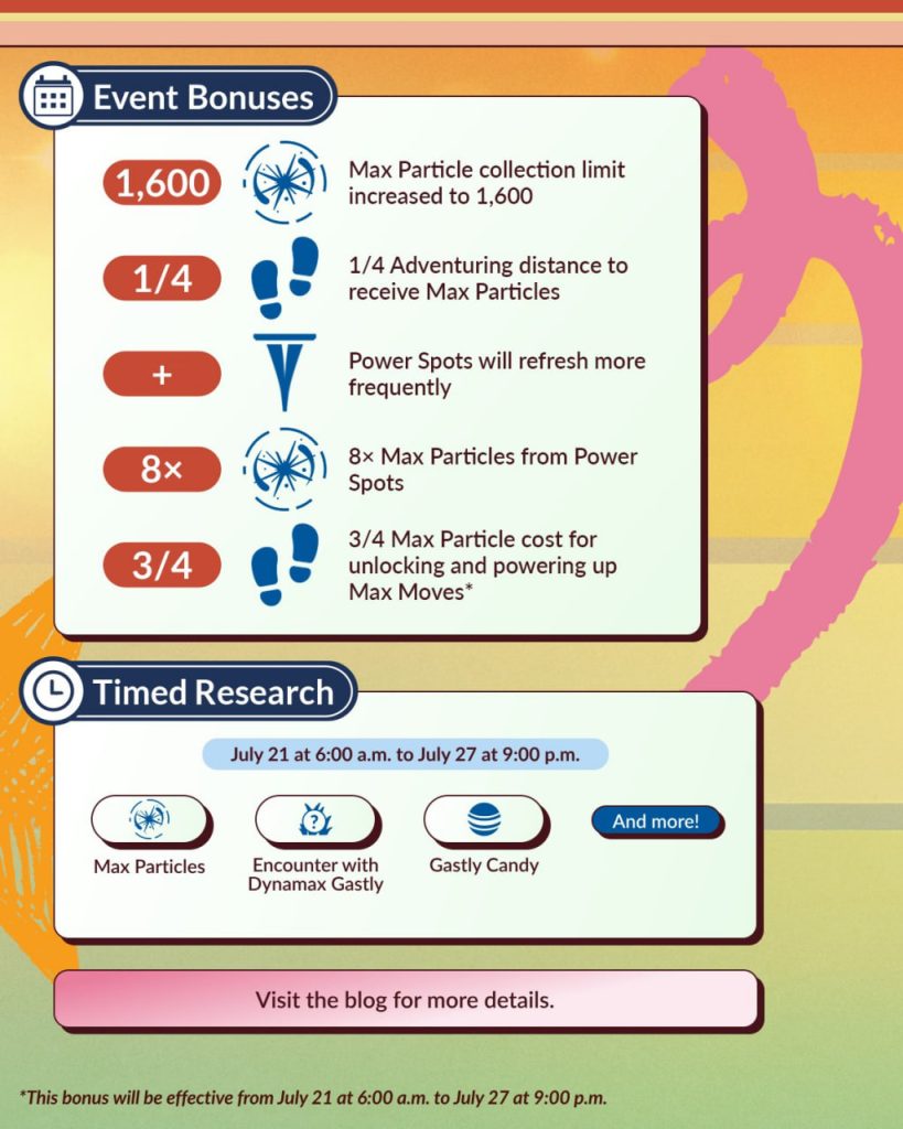 Desde el lunes 21 de julio a las 6:00 hasta el final del evento habrá una investigación temporal gratuita, al completarla obtendremos a un Gastly Dinamax junto a caramelos y Partículas Max que nos ayudarán a potenciarlo para hacerle frente a Latios y Latias Dinamax.
