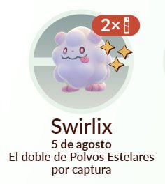 La hora destacada de esta semana será la de Swirlix, con doble de Polvos Estelares por Captura. Esta tendrá lugar el martes 5 de agosto de 18:00 a 19:00, hora local.