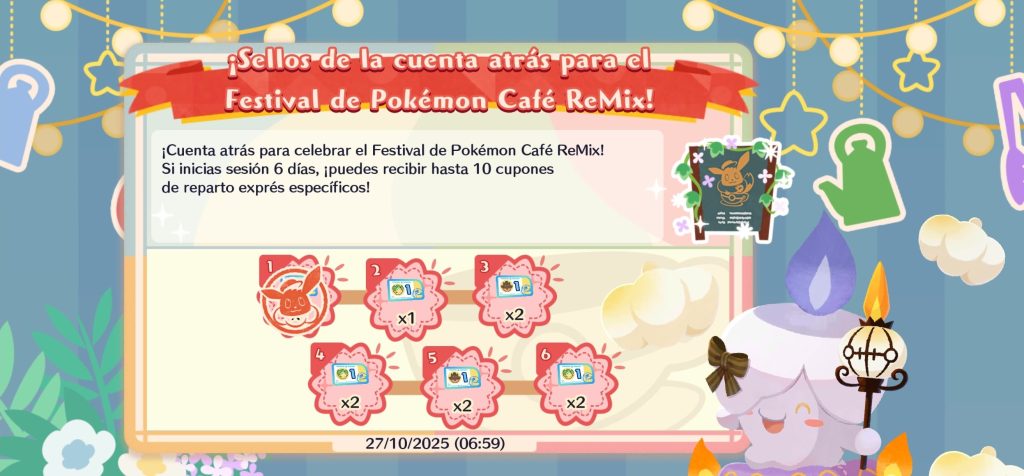 También tendremos disponibles hasta 5 Cupones de Reparto Exprés x1 del Evento de Reparto de Leafeon Festival y Quagsire, con el nuevo Evento de Inicio de Sesión Diario, titulado ¡Sellos para la cuenta atrás para el Festival de Pokémon Café ReMix!.