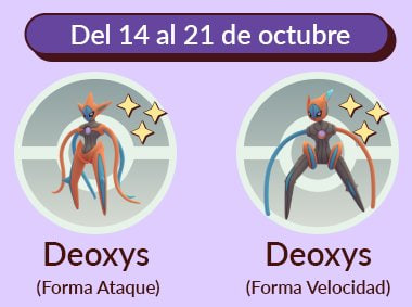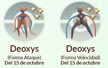 Además, Deoxys en sus formas Ataque y Velocidad serán los protagonistas de la hora de incursiones del miércoles 15 de octubre de 18:00 a 19:00, hora local.