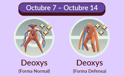 En las incursiones legendarias tendremos la presencia de Deoxys en sus formas Normal y Defensa, quien cambiará sus formas por Ataque y Velocidad el martes 14 de octubre.
