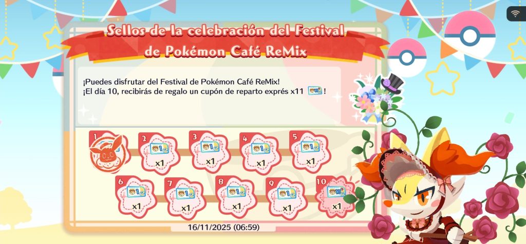 También tendremos disponibles hasta 10 Cupones de Reparto Exprés x1 del Evento de Reparto de Braixen Rosas Góticas, así como 1 Cupón de Reparto Exprés x11 del Evento de Reparto de Braixen Rosas Góticas con el nuevo Evento de Inicio de Sesión Diario, titulado Sellos de la celebración del Festival de Pokémon Café ReMix.