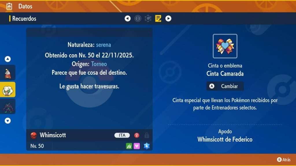Pokémon Escarlata y Pokémon Púrpura cuentan con un nuevo evento de distribución mediante código de regalo misterioso. En esta ocasión, se trata de un Whimsicott, el cual fue utilizado por el jugador Federico Camporesi durante las partidas competitivas del Campeonato Internacional de Norteamérica (NAIC) 2025.