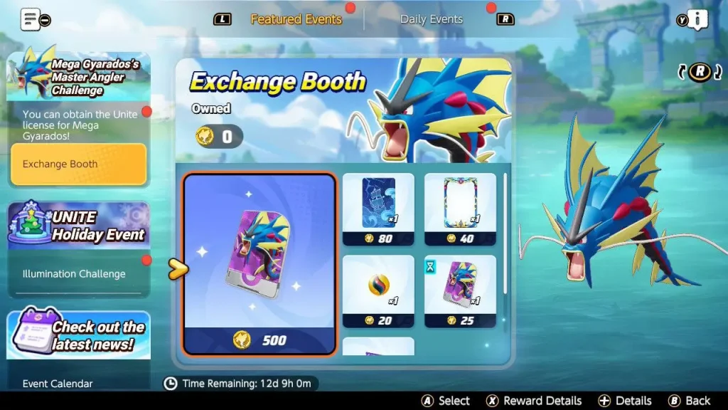 En último lugar, durante el día de ayer se ha lanzado Mega-Gyarados como Pokémon jugable. La licencia Unite de Mega-Gyarados actualmente únicamente puede obtener participando mediante puntos en un evento temporal de 12 días, en el que por 500 fichas podrá desbloquearse la licencia de manera permanente.