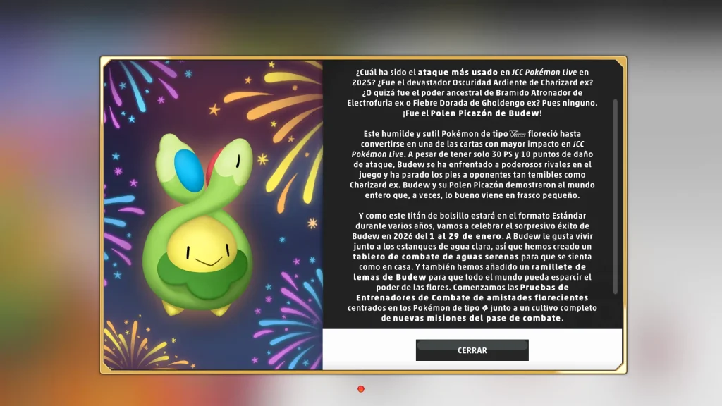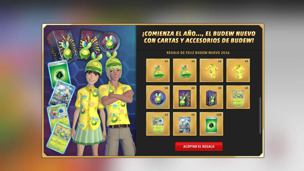 El evento Feliz Budew Nuevo estará disponible en Pokémon TCG Live desde jueves 1 de enero hasta el jueves 29 de enero de 2026. Todos aquellos que inicien sesión en la aplicación durante el período indicado (ya sea en dispositivos móviles o en equipos de sobremesa) recibirán varios regalos inspirados en Budew y en Año Nuevo.