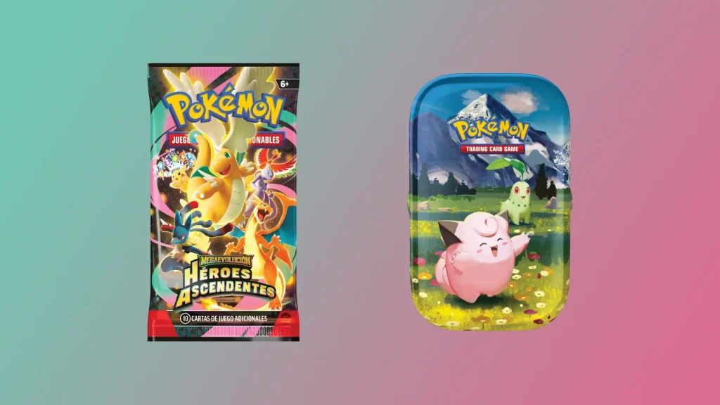 - Minilata Megaevolución-Héroes Ascendentes (disponible el 20 de febrero de 2026): Incluye dos sobres de mejora de Megaevolución-Héroes Ascendentes junto con una tarjeta y una tarjeta adhesiva que muestran la ilustración de la minilata.