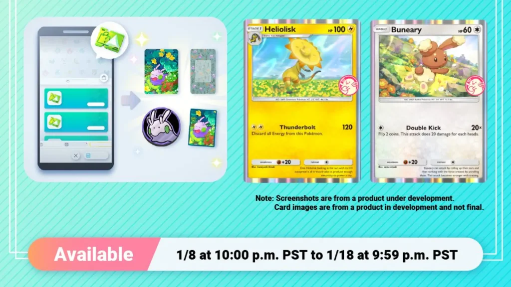 Durante este evento, al acceder a las Elecciones Chansey, podréis encontraros ocasionalmente con las «Elecciones Chansey», que contendrán, de forma aleatoria, cartas promocionales de Heliolisk y Buneary, entre otras recompensas. Estas elecciones serán fácilmente reconocibles gracias a su insignia especial visible en el título.