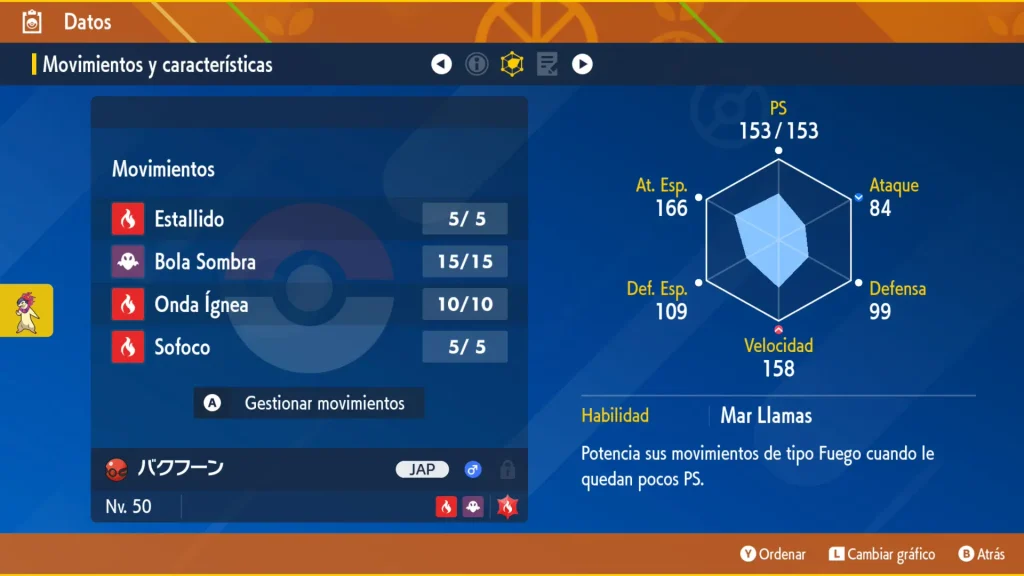 - Movimientos: Estallido, Bola Sombra, Onda Ígnea, Sofoco.