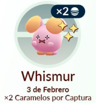 La hora destacada de esta semana será la de Whismur con doble de Caramelos por Captura. Esta tendrá lugar el martes 3 de febrero de 18:00 a 19:00, hora local.