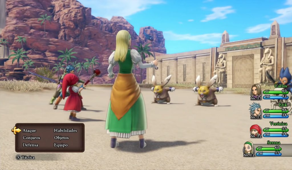 El gameplay es exactamente lo que esperas, turnos clásicos con una posibilidad de critico, fallar y uso de habilidades y objetos. Dragon quest juego en casa y nunca lo ha ocultado, así que si te gusta una sensación de juego como las de antes este es tu juego.