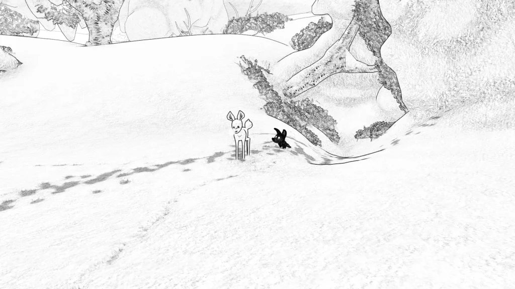 Y es que, Blanc destaca únicamente por su apartado artístico, visual y auditivo. Los tráilers llamaron mucho la atención por la particular forma de mostrar el entorno y probablemente porque tanto el cervatillo como el lobito son adorables. Sin embargo, me gustaría hablar de la comunicación que existe tanto entre los protagonistas de este videojuego: sus gruñidos. No vamos a dejar de escucharlos en ningún momento, ya sea porque se enfadan entre ellos, porque están felices o porque quieren comunicar un sentimiento. Ese es el punto fuerte de Blanc: apuesta porque el jugador entienda los sentimientos y necesidades de los protagonistas.
