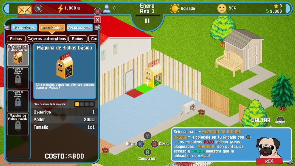 Entre los Desafíos del Modo Campaña, encontraremos un pequeño tutorial que nos introducirá todas las mecánicas y detalles que debemos conocer para poder ser unos expertos en marketing. Nos empezarán introduciendo los Cajeros Automáticos y las Máquina de Fichas, con estas dos adquisiciones, los clientes tendrán una forma fácil de poder participar en las máquinas recreativas. Seguidamente, también será importante establecer Puestos de Comida, Bebida y Aseo para poder aumentar el tiempo que esté cada persona en el recinto. Disponer de al menos un aparato o mueble de cada uno de estos tipos será crucial para satisfacer las demandas más básicas de cada uno de los clientes, siendo igual de importante disponer de cada uno de ellos que de las propias máquinas arcade.