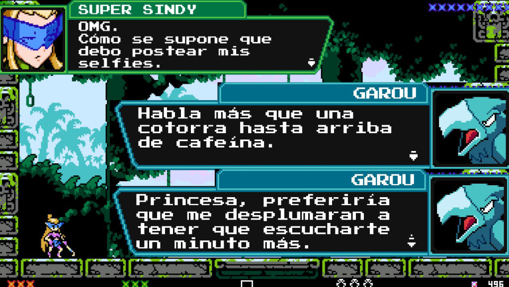 Visualmente, el juego es claro y agradable. Desarrollar un juego actualmente y apostar por los 8-Bit es una decisión sin duda arriesgada, ya que requiere de cierta experiencia para conseguir un acabado final que logre alcanzar esta estética tan atractiva y, como dije anteriormente, X Plus Games lo consigue con creces. Además, cuenta con una maravillosa localización al castellano y diálogos llenos de un humor muy refrescante, la mayoría protagonizados por Garou, un cuervo que nos acompañará en nuestra aventura.