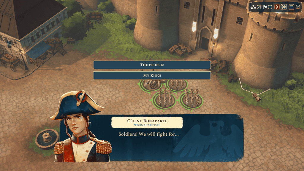 En primer lugar encontraremos que, nada más empezar, deberemos elegir que miembro de la familia Bonaparte nos representará. A pesar de que este apellido tuvo una enorme importancia en la Revolución Francesa, veremos que los nombres de los personajes no pertenecen a ningún miembro real de esa familia, siendo personajes inventados para ayudar a que el jugador se autoinserte en la historia.