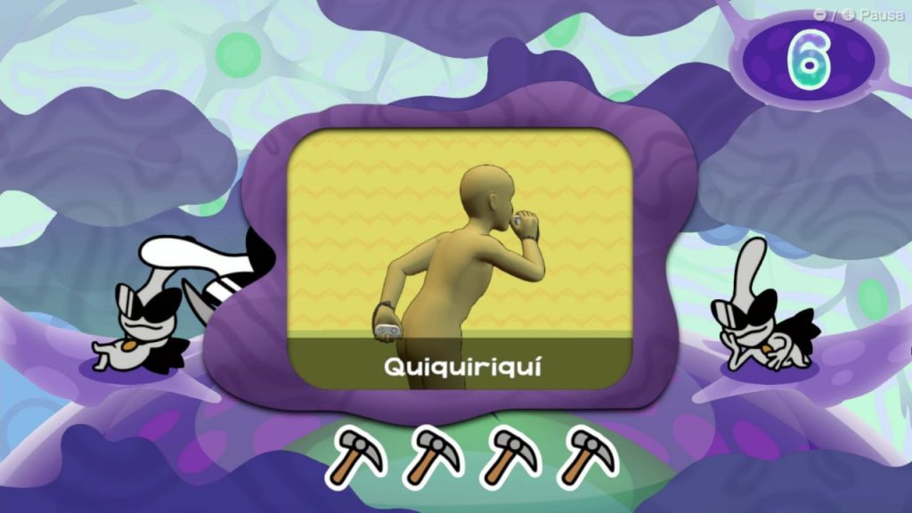 Sobre el ritmo, cuando comienzas un nivel puede tener de 2 a 3 posiciones nuevas y cuando salta un minijuego que la utiliza por primera vez el juego se detendrá para explicárnosla… muy… lentamente… si, no son mas que ¿2 minutos? pero sumando pueden ser ¿10? ¿15? Son bastantes y variadas, y aunque eso se agradezca mas adelante, al principio es frustrante que algo tan frenético como los microjuegos se detengan tanto rato. El juego maneja muy bien esto en su segunda mitad, donde añade un concepto que es el botón contextual, a la posición le tenemos que echar imaginación y por ejemplo imaginar que en la posición de «Gallina» donde imitamos que tenemos un pico estamos siendo un dentista con un taladro y tendremos que, sin una explicación, entender por el propio contexto que botón es el que necesitamos pulsar acorde a la posición, volviéndolo dinámico, fresco y de nuevo sin pausas molestas.