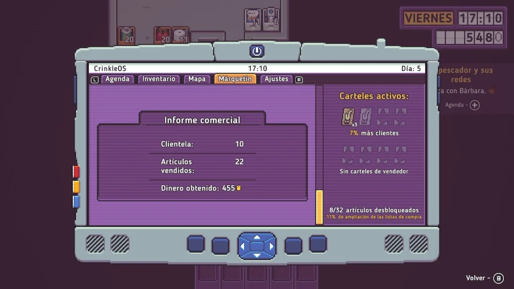 A pesar de que la tienda es nuestra fuente principal de ingresos, tendremos la oportunidad de enriquecernos recogiendo desperdicios en la vía pública y reciclando los embalajes en los que llegan los productos que vendemos, por ejemplo. También será crucial publicitar Discounty gracias a carteles que podremos imprimir y colgar en varias partes del pueblo, los cuales tendremos que ir reponiendo cada semana. Por si fuera poco, la valoración de satisfacción de los clientes al hacer una compra también puede otorgarnos más beneficios al acabar la jornada, como muestra el PDA en el informe comercial diario.