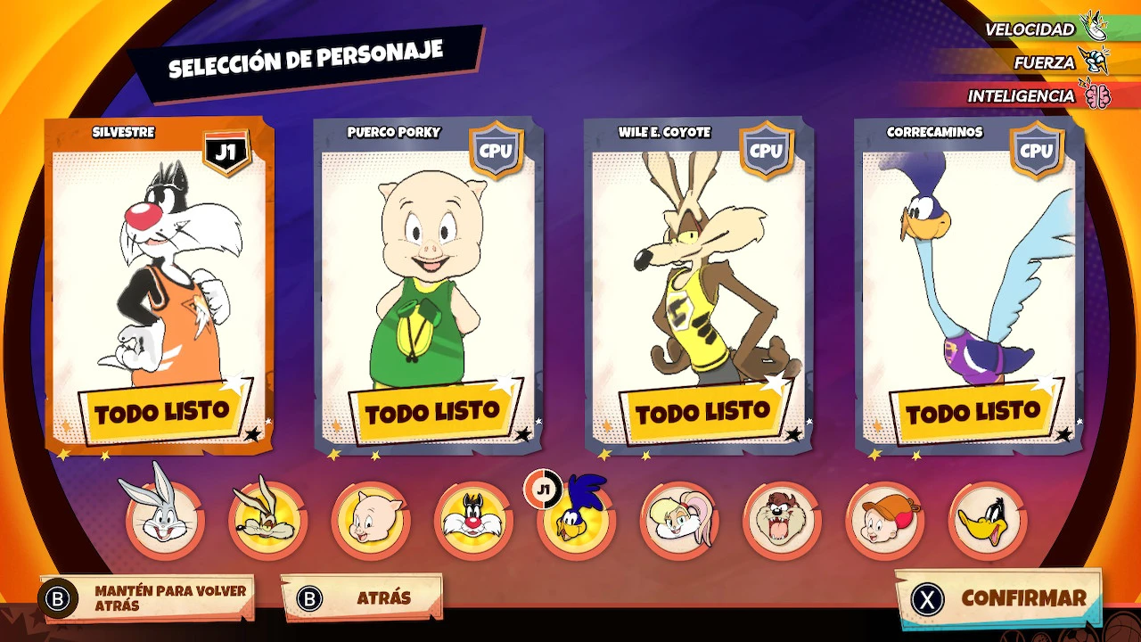 El juego cuenta con 9 personajes jugables: Bugs Bunny, Wile E. Coyote, Cerdito Porky, Silvestre, Correcaminos, Lola Bunny, Pato Lucas, Elmer Gruñón y Taz. Como podéis observar, el elenco disponible presenta algunas de las caras más carismáticas de los Looney Tunes. Cada personaje tiene tres estadísticas, las cuales podremos observar en la pantalla de selección: velocidad, fuerza e inteligencia. Los puntos de estas estadísticas van del 1 al 5, siendo 1 el mínimo y 5 el máximo.