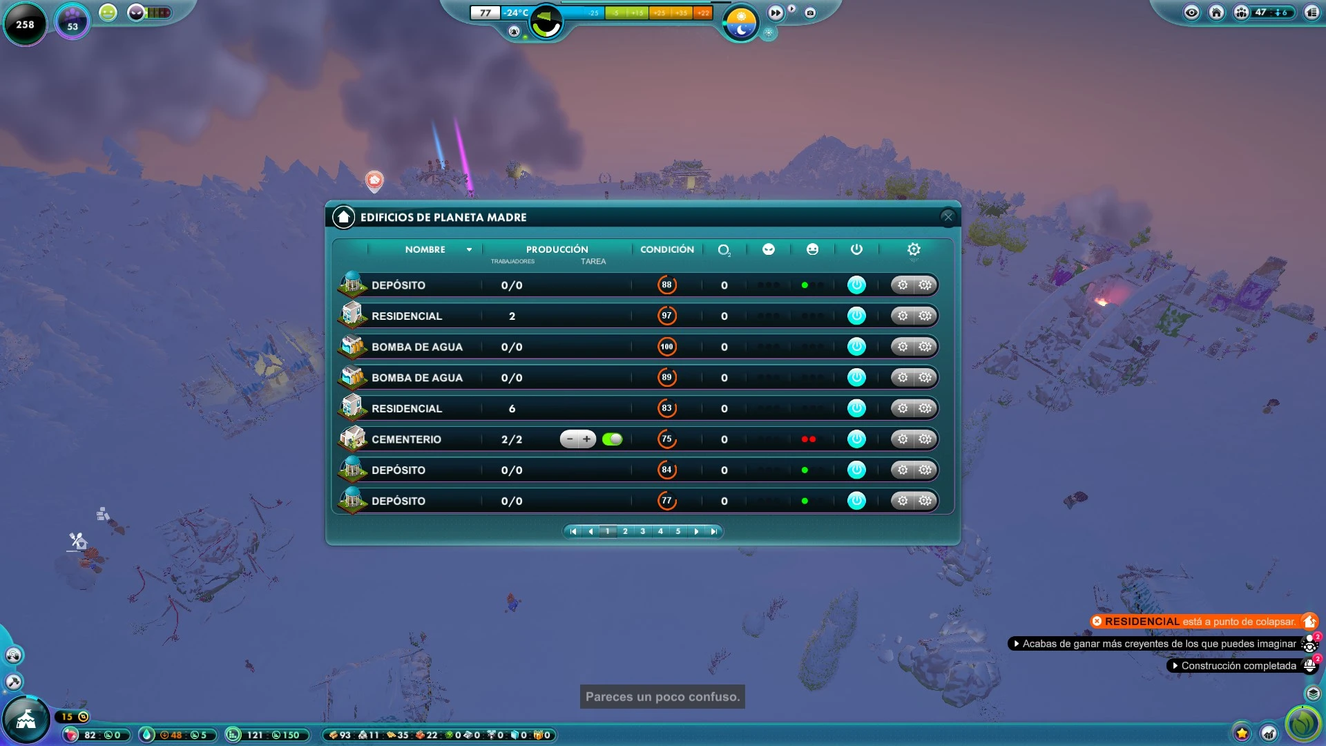 En cuanto a la edificación del planeta, debemos ser conscientes de que a medida que se expanda nuestro pueblo tendremos que suplir sus necesidades. Por ejemplo, el edificio de ‘ingenieros’ (encargado de hacer que las construcciones del pueblo no se rompan) tiene un radio limitado de efecto, así que tendremos que construir varios de estos edificios para que su efecto alcance a todas las edificaciones. Lo mismo ocurre con los almacenes y la mayoría de edificios.