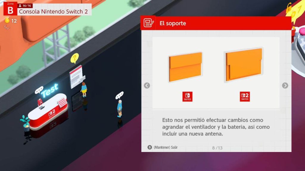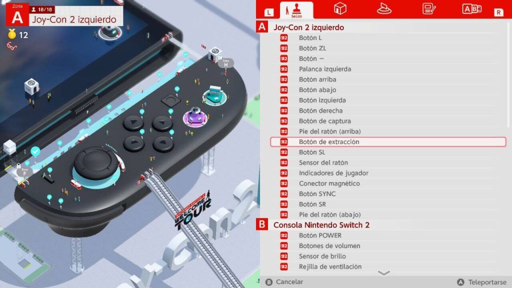 La exploración comenzará desde el Joy-Con 2 izquierdo, el de color celeste. Allí empezaremos a entender el funcionamiento básico del juego, que consiste en reunir sellos que encontraremos en lugares destacables de la consola, como pueden ser los botones de direcciones, el joystick, los botones traseros, los imanes, los conectores y demás. Al acercarnos, se nos entregará un sello. En caso de tener todos los sellos de un componente de la consola, podremos seguir avanzando, que en este caso será al cuerpo de la consola, y así continuamente, tras desbloquear todas las ubicaciones posibles y recorrernos todos los componentes.